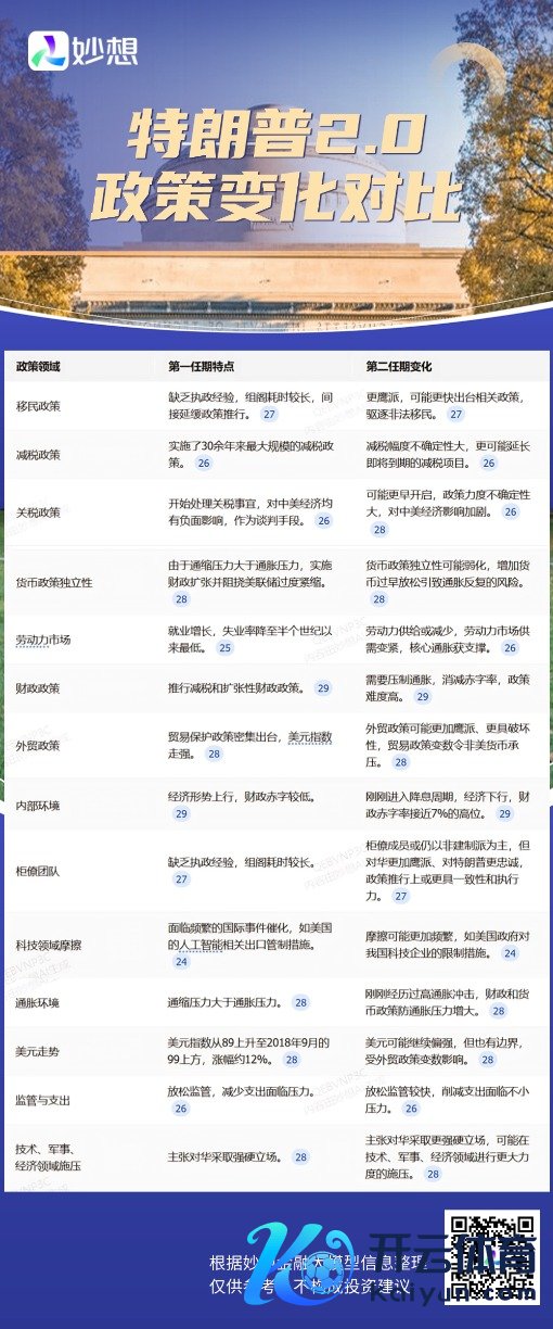 在行将到来的 “特朗普 2.0 时间”,特朗普的计谋比拟其第一任期发生了哪些变化?哪些迎来了“Plus”,又有哪些发生了转向?妙思进行了一图对比:
