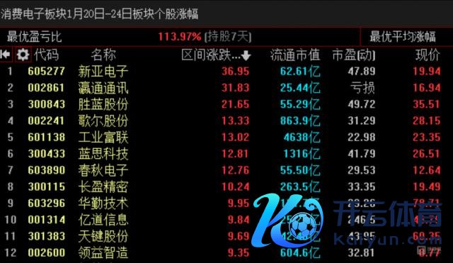 * 市集证据:消耗电子板块 1 月 20-24 日历间涨幅超 20% 个股 3 只,其中新亚电子涨幅 36.95%,十余只个股涨超 10%。